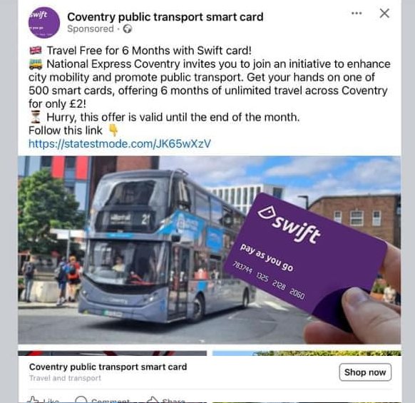 The offer is bogus, and is nothing to do with TfWM or National Express Coventry, and even if it was, then it would come from their own social media accounts, rather than from some generic “Coventry public transport smart card”.
